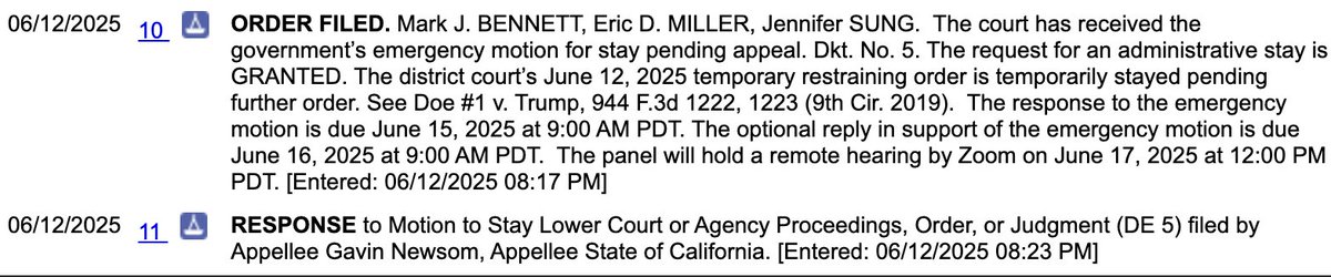 BREAKING: 9th Circuit panel grants administrative stay of Judge Breyer's ruling. This allows Trump to keep National Guard deployed for a few more days while three judge panel considers the case.