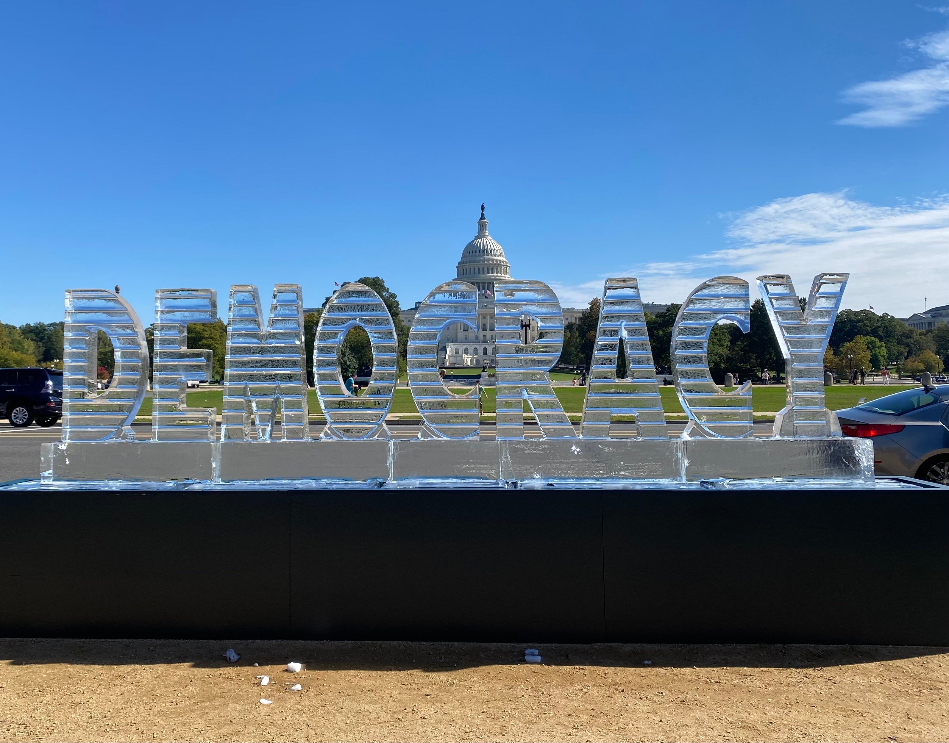 WASHINGTON Democracy literally melted away in D.C. on Wednesday after activists unveiled a 3,000-pound ice sculpture of the word by the U.S. Capitol, a statement on Americas weakened state of democracy under the Trump administration.