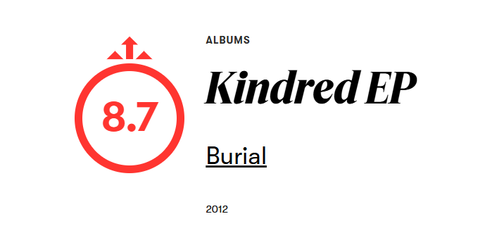 It's hard to talk about Kindred-- whether in the context of electronic dance music or just in the Burial discography itself-- without resorting to superlative terms, because it really is just that impressive. It's easy enough to take a talent such as Burial for granted, but Kindred is like a convenient slap in the face, a wake up call. Never before has his music possessed this much majesty, this much command, this much power: The pathos here has moved from sympathetic to completely domineering. The amount of dialog around Burial can be a little hard to swallow sometimes, especially when the guy himself seems so resistant-- or at least indifferent-- to the ongoing intellectualization of his music. But what we get on Kindred isn't some loner unknowingly making genius out of samples from Metal Gear Solid on his Playstation. You might not think of refinement when you think of Burial's productions, but just try to imagine it, and you'll get an idea of the kind of glory that Kindred carries. It still might not be the follow-up to Untrue that everyone's been waiting for, but format feels completely irrelevant. When those beats fall into place on the title track, nothing else matters for the next 30 minutes, until the crackle and fizz of "Ashtray Wasps" finally fades away. Then you put it on again. And again. And again.