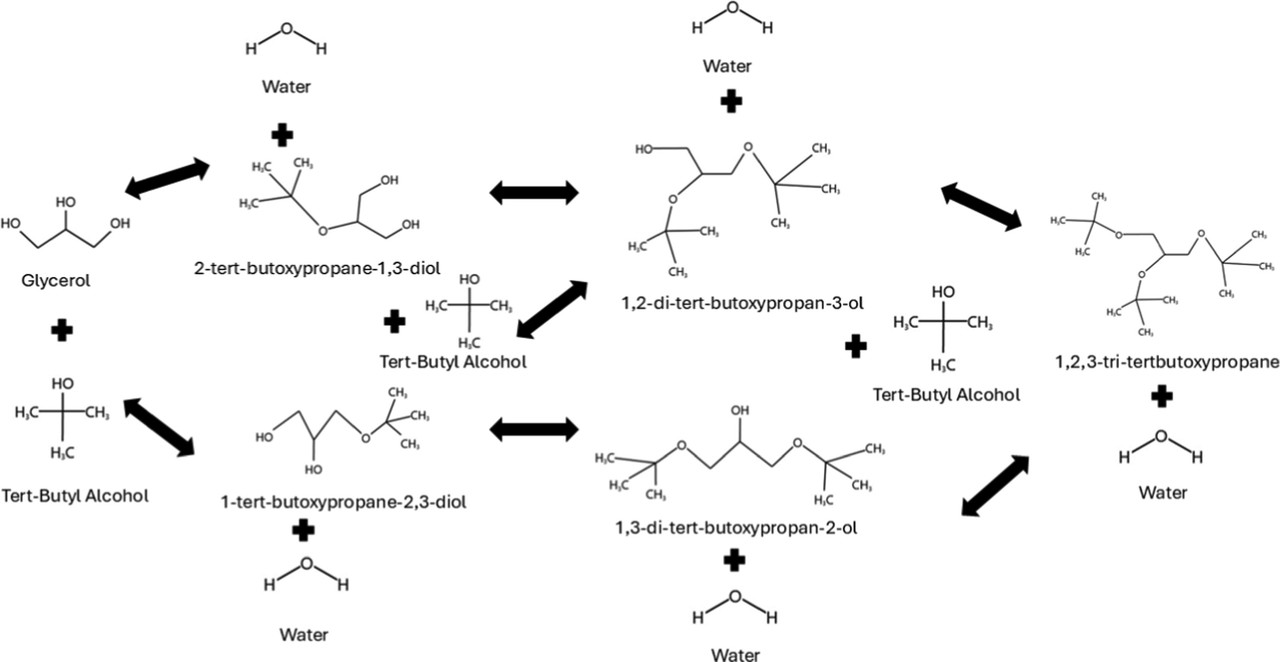 The etherification of glycerol with tert-butyl alcohol (TBA) follows a consecutive reaction pathway (see Figure 1), resulting in the formation of a mixture of mono-, di-, and tri-tert-butyl glycerol ethers. (21) This process is catalyzed by CO2-modified microwave hydrochar (M-H200 + CO2) and occurs under microwave-assisted conditions at a CO2 pressure of 1.5 MPa, 110 °C of temperature, and a TBA to glycerol molar ratio of 6:1...